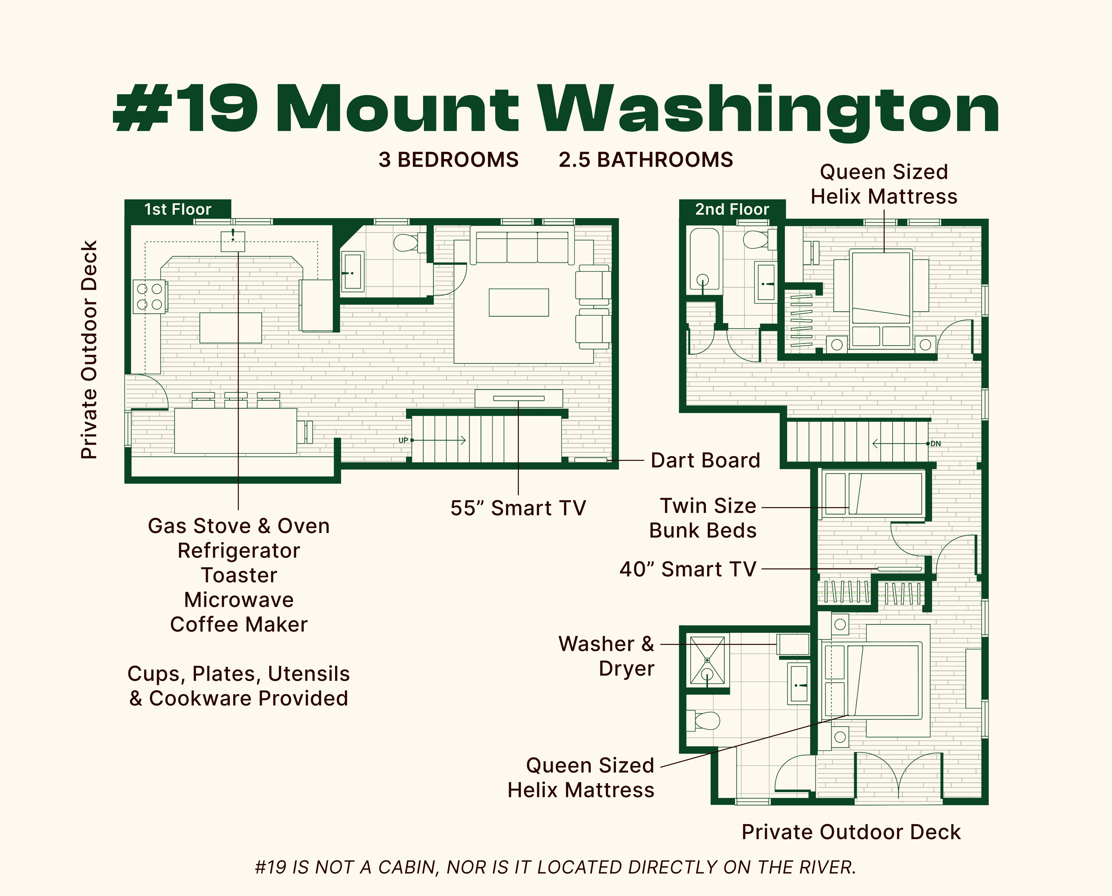 Mount Washington is a newly renovated two-story apartment (Summer 2024), offering the most space of any unit at Pemi Cabins. With multiple bedrooms, private decks, and a large dining area, it’s ideal for families or groups looking for a comfortable getaway in the White Mountains.