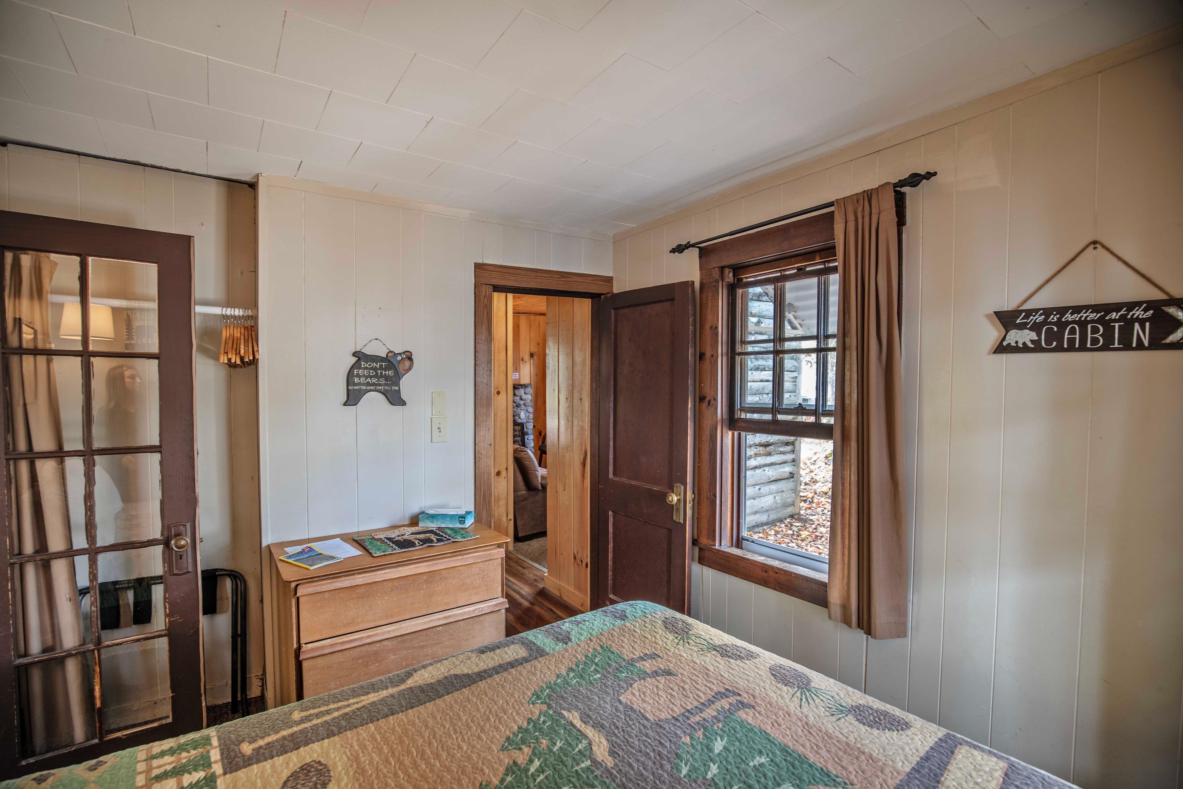Two separate bedrooms, each with a queen-sized bed, fresh linens, and curtains for restful sleep. Guests often enjoy nature’