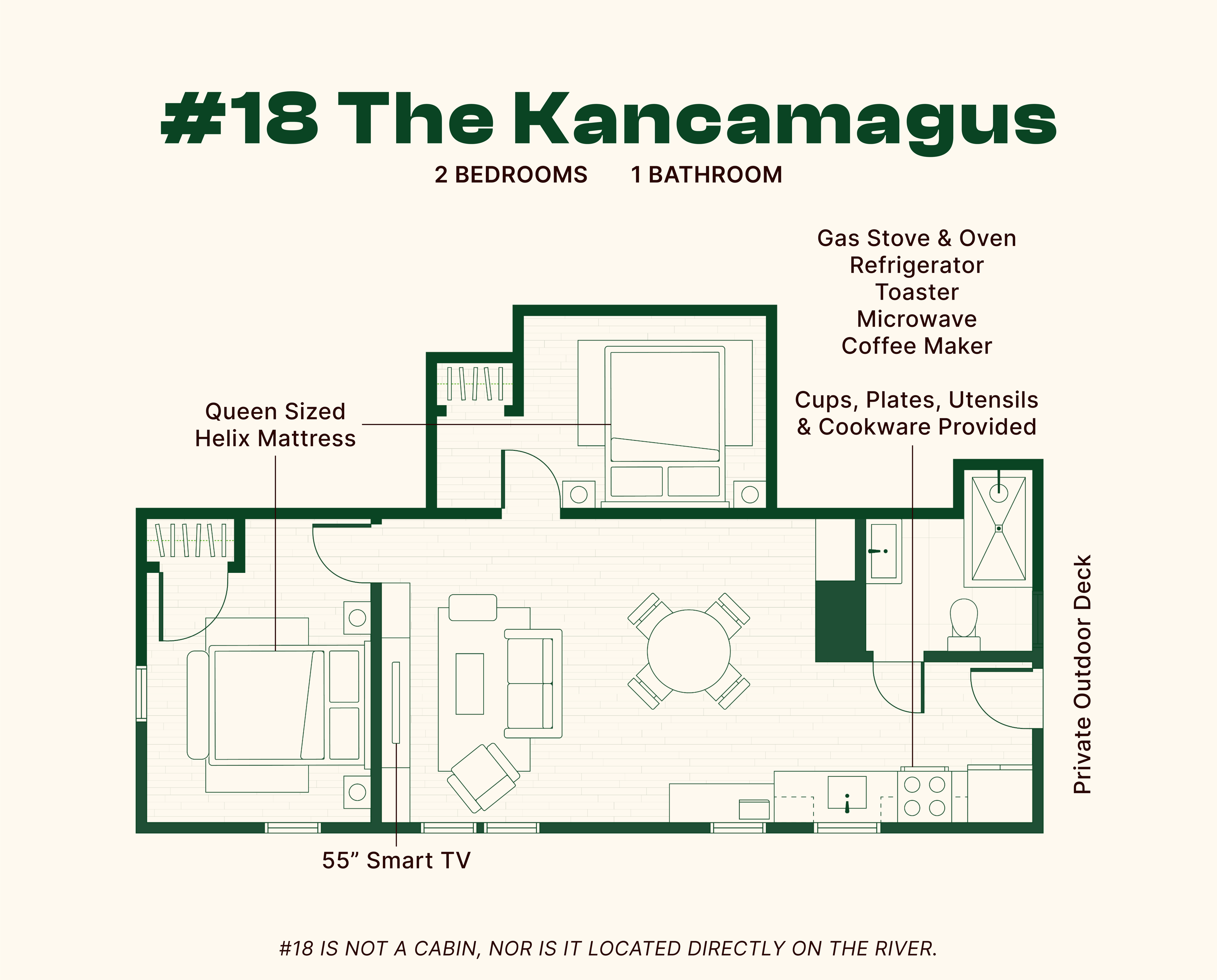 The cabin accommodates up to four guests and includes the following: