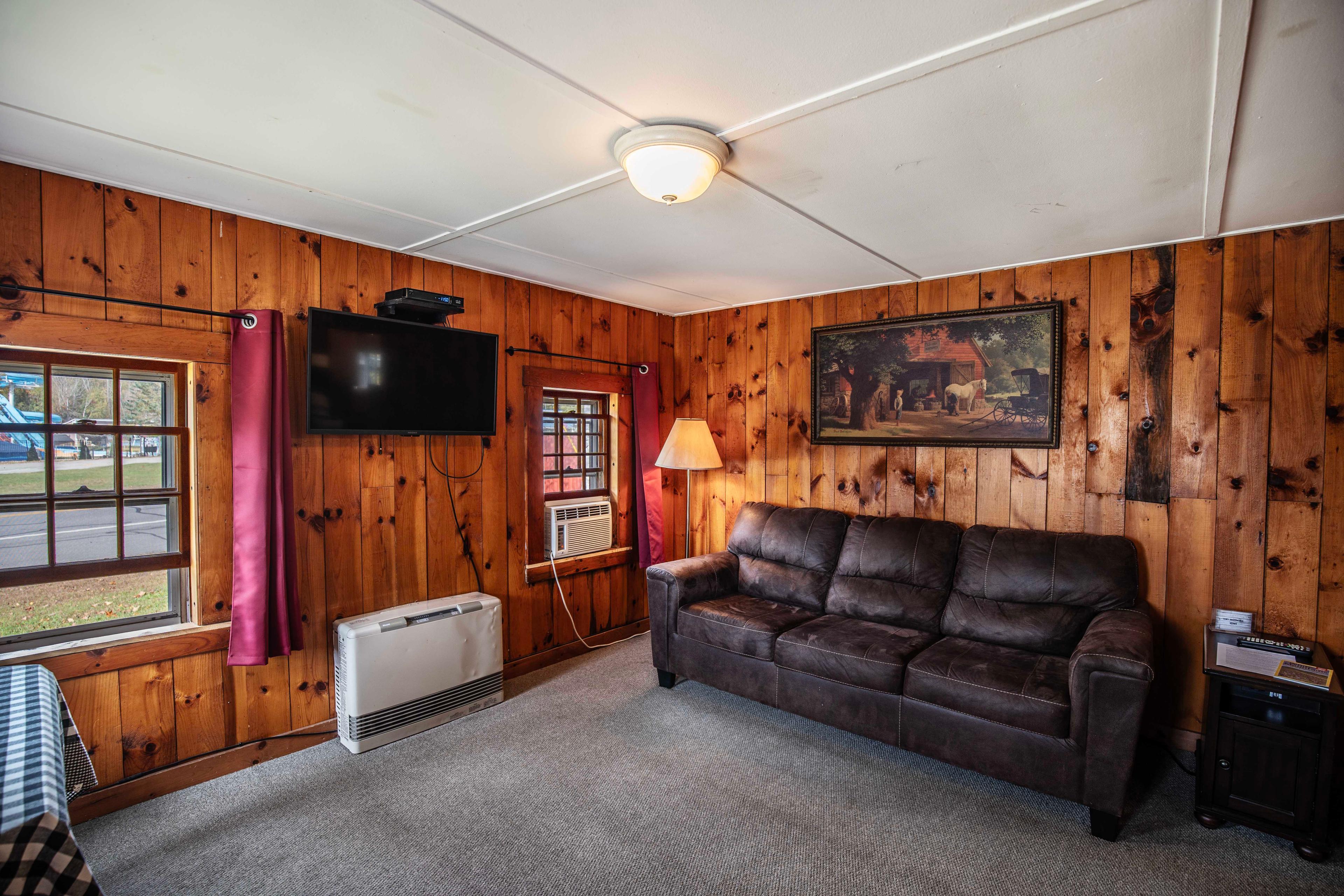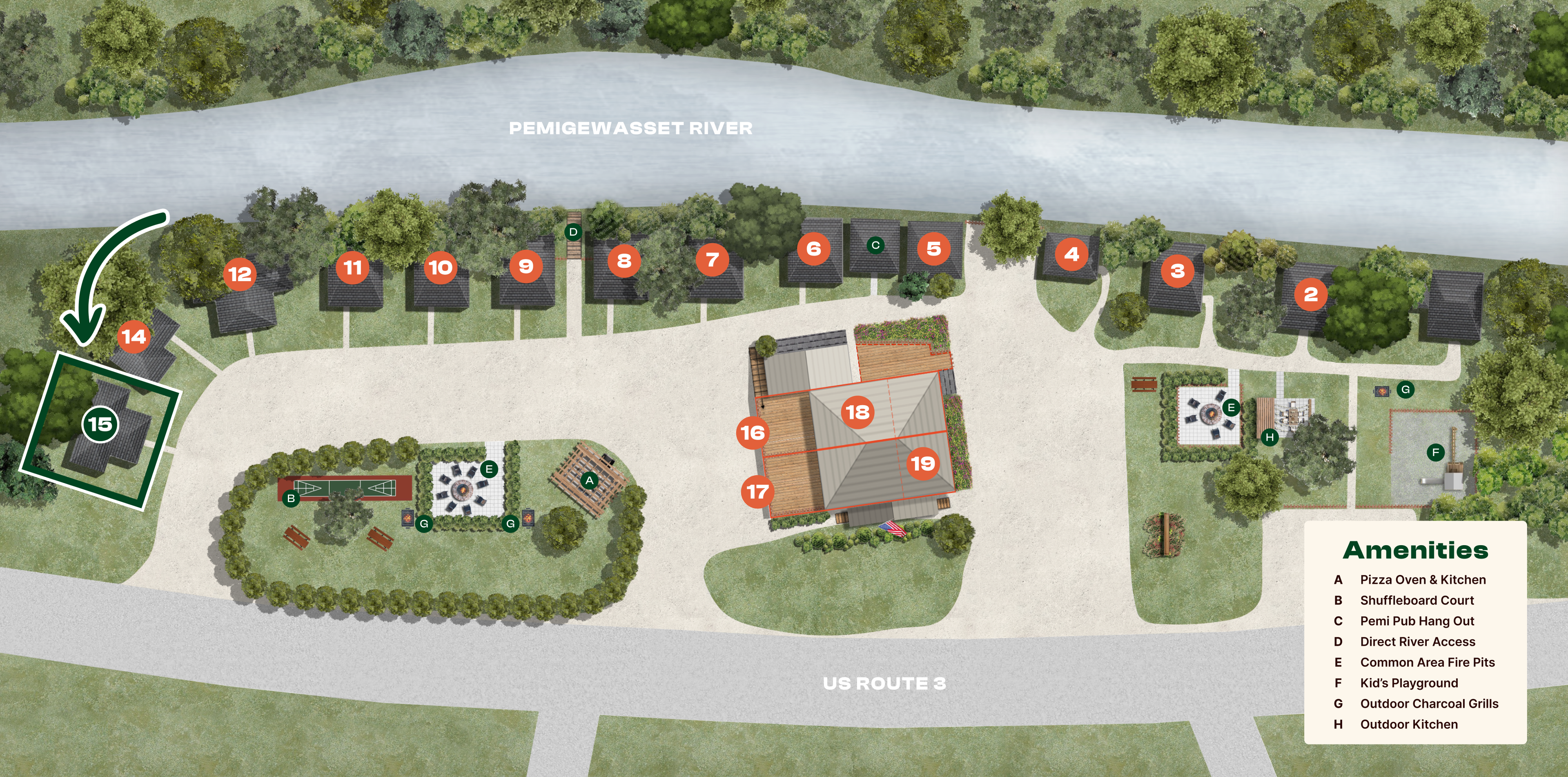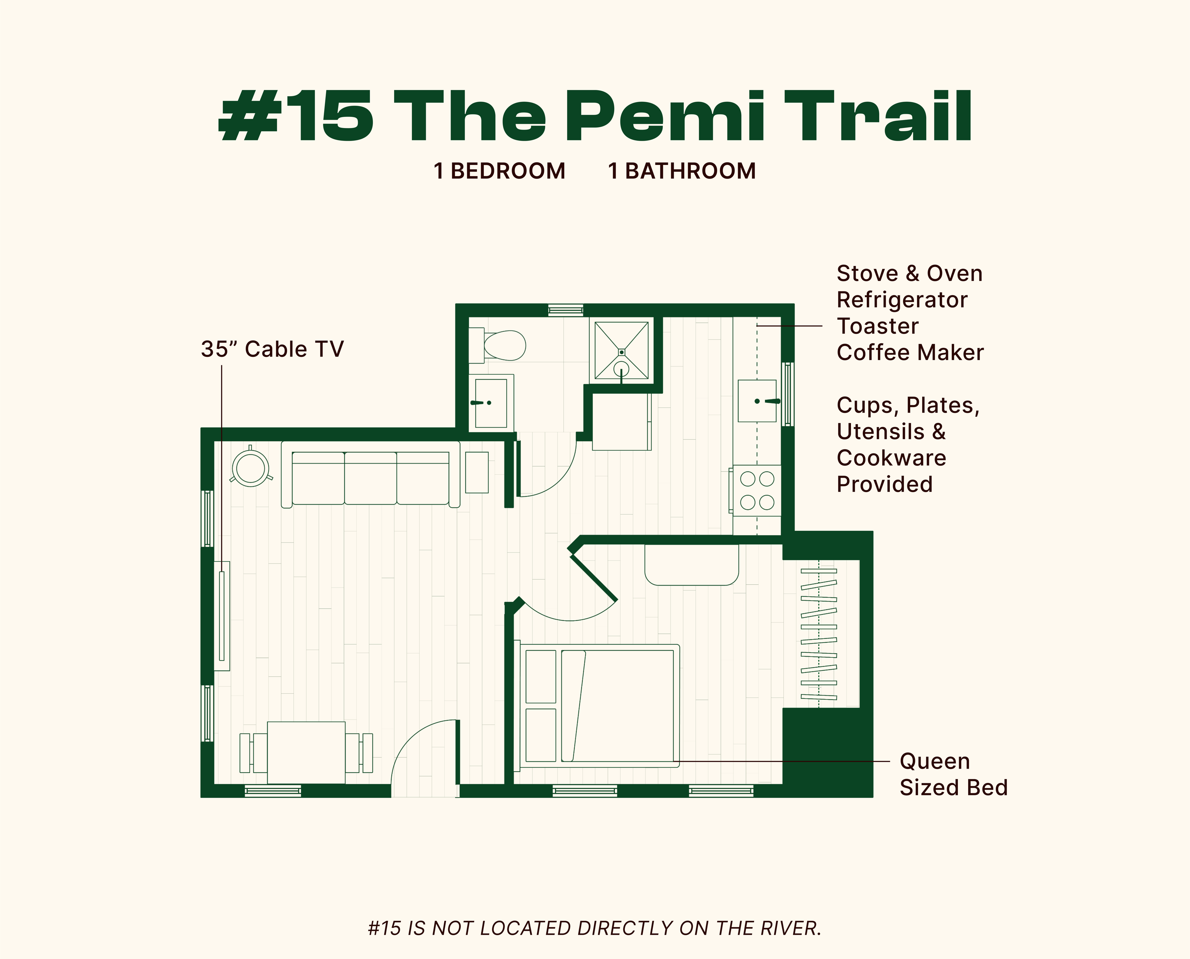 The Pemi Trail is a cozy one-bedroom cabin on the far left side of the property, neighboring only Cabin 14. While not a riverside unit, it’s a short walk to our shared outdoor areas and a comfortable home base for two.